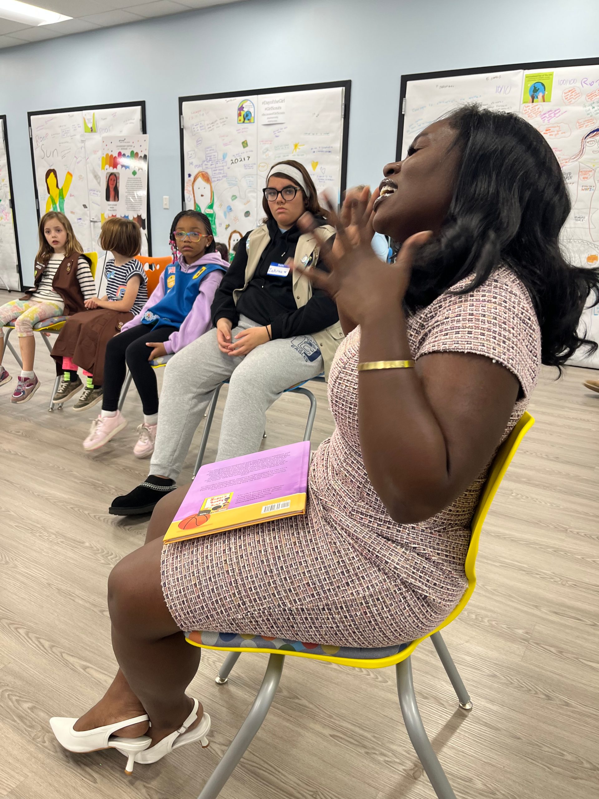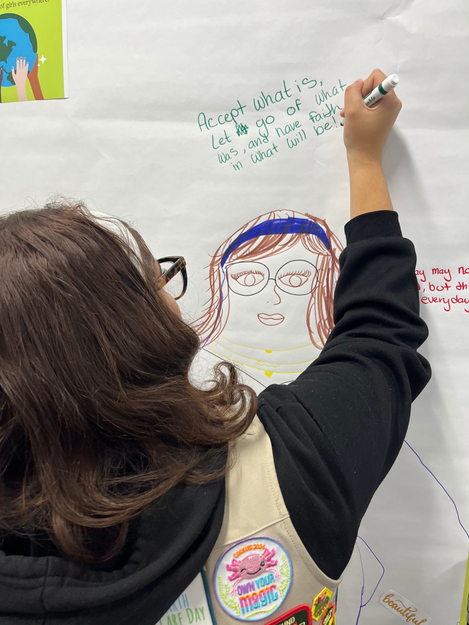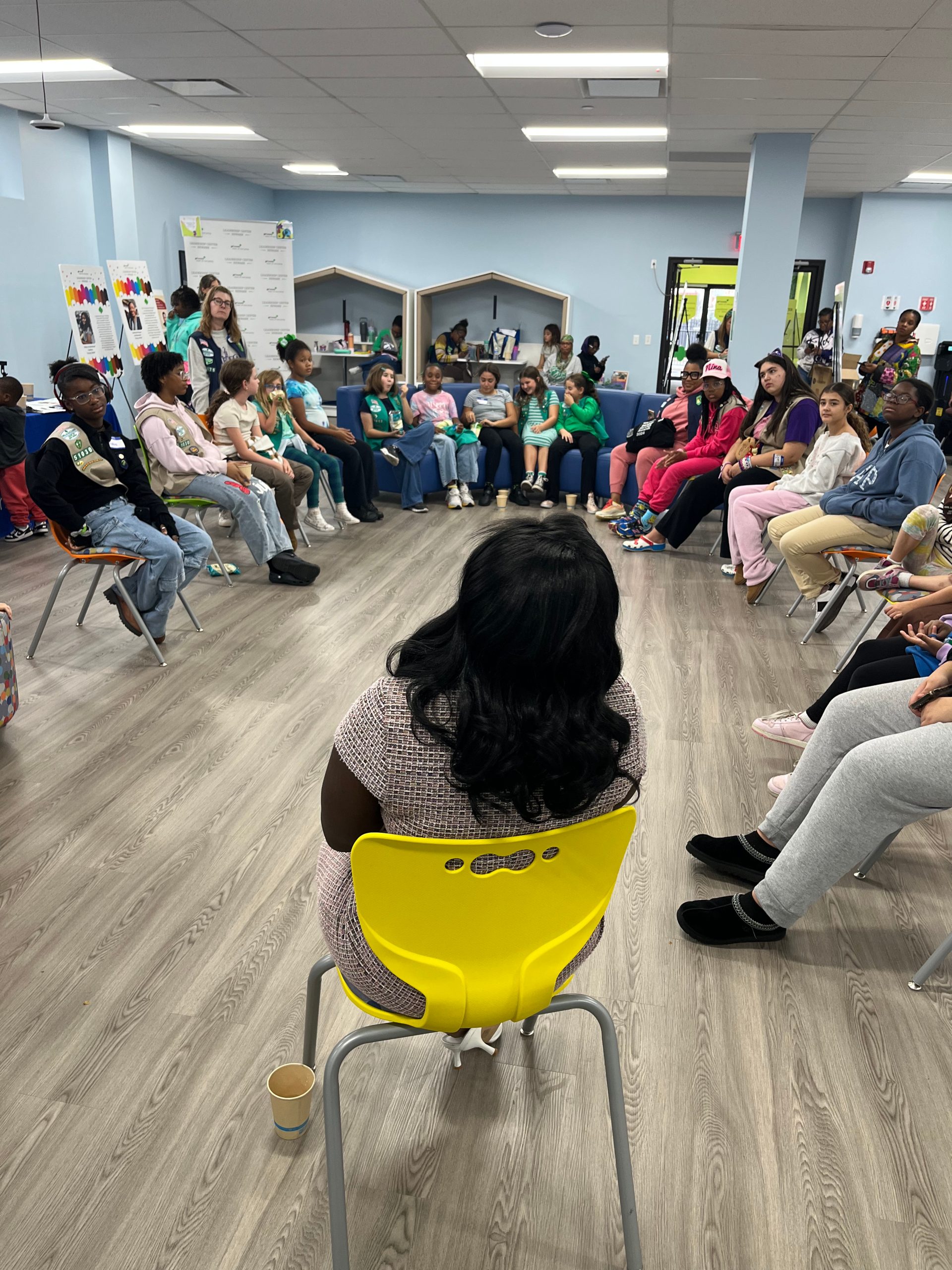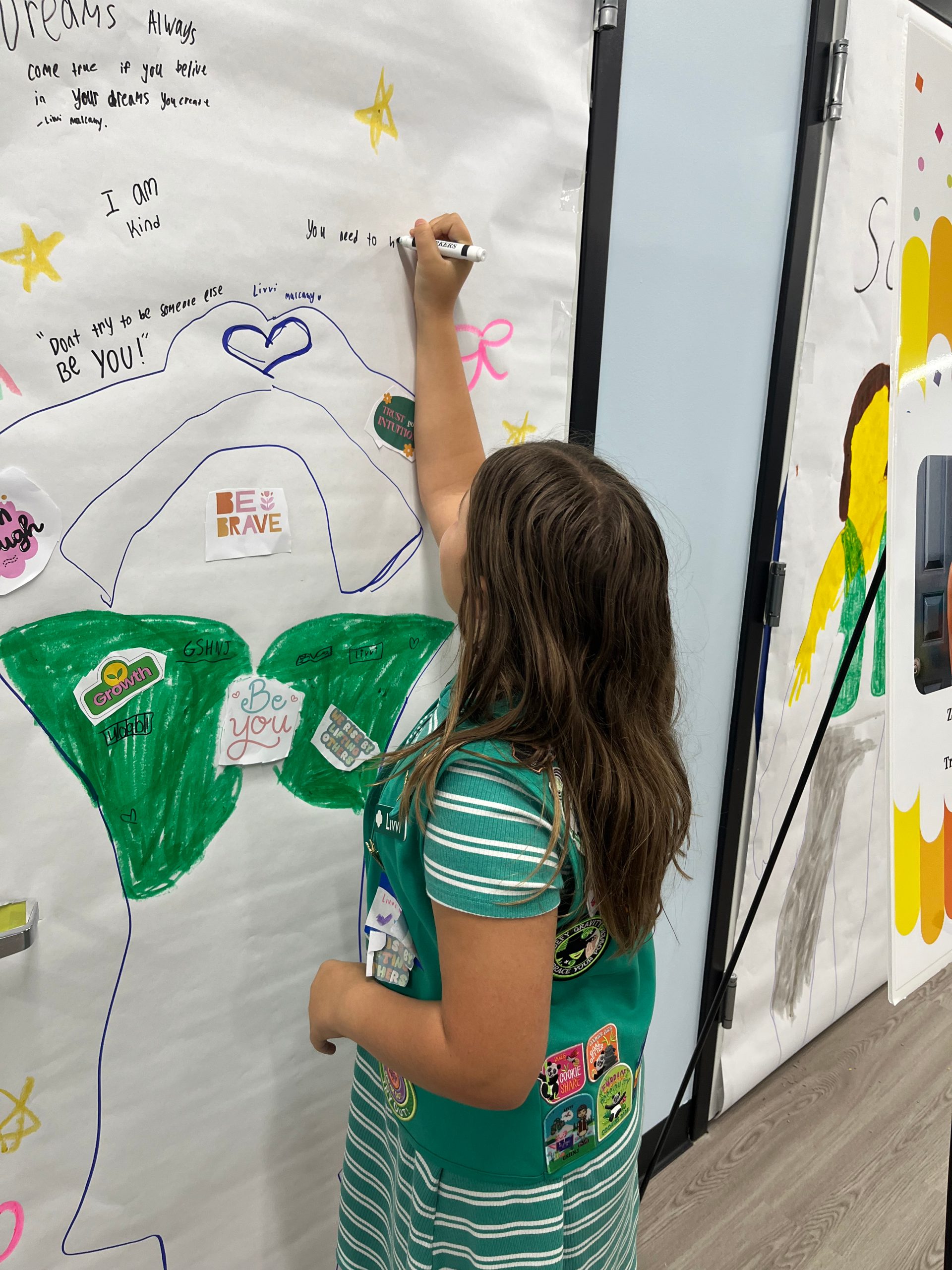 Girl Scouts created a “Filled with Words of Affirmation” group art installation, covering one side of the Leadership Center with their outlines and quotes. They then extended their voices in a storytelling circle with Newark Poet Laureate Margie “Mia X” Johnson, strengthened their speaking skills with TEDx speaker and Brown Kids Read founder Ssanyu Lukoma, had fun with Jump Kids Health, and engaged in a Guided Oriki activity inspired by the book Rising Troublemaker by Luvvie Ajayi Jones.